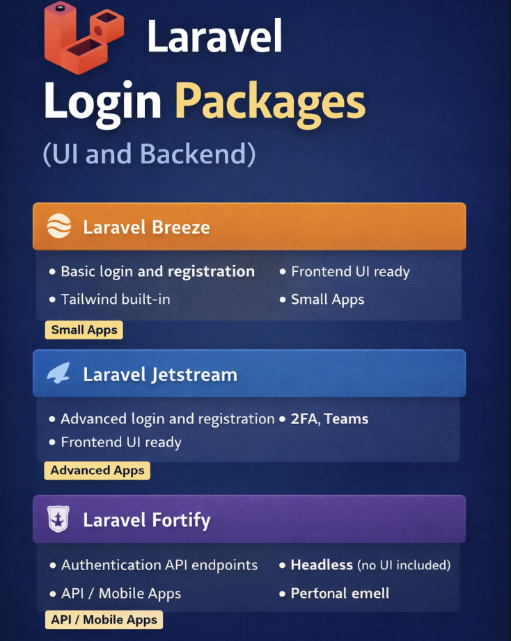 Overview: Backend-only authentication package by Laravel. Perfect for API-driven or mobile-first apps.